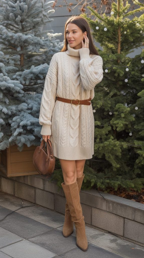 Here’s my go-to when I want to look put-together without trying too hard. A chunky knit sweater dress with knee-high boots is the definition of “effortless winter glam.”