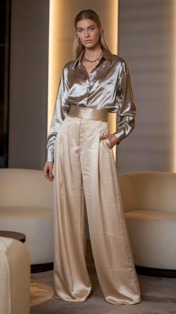 If dresses aren’t your thing, say hello to the power of tailored trousers. Go for wide-leg or high-waisted pants in a luxe fabric like wool or satin, and pair them with a shimmer blouse or metallic cami top.
