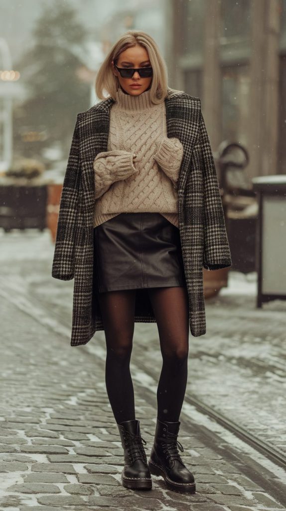 3. Leather Mini Skirt + Chunky Knit + Tights + Combat Boots