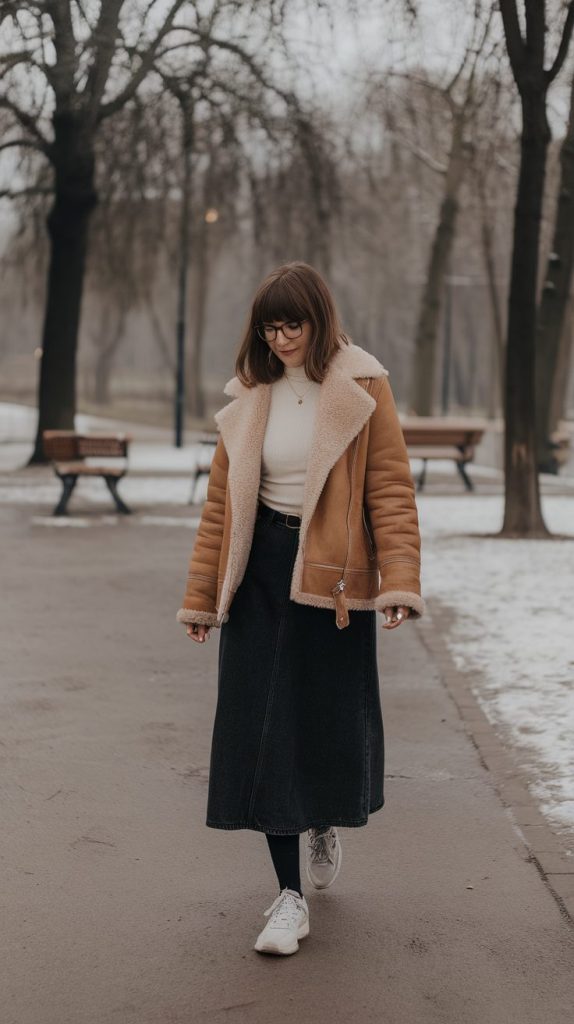 5. Denim Skirt + Thermal Top + Shearling Jacket + Sneakers