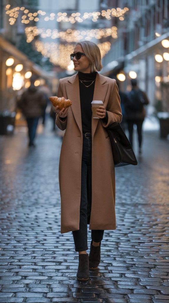 Why it works: The look is refined yet warm. It’s the kind of outfit that whispers, “Yes, I booked this trip for the Christmas markets and the photos.”