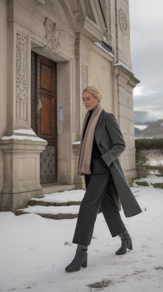 Opt for dark skinny jeans or tailored trousers, a cashmere turtleneck, and a long wool coat. Add ankle boots with a low heel—trust me, your feet will thank you after hour four.