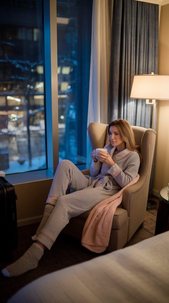 Think matching knit set or flannel pajamas with fuzzy socks and a light robe. It’s cute enough for room service selfies but warm enough for a chilly hotel room.
